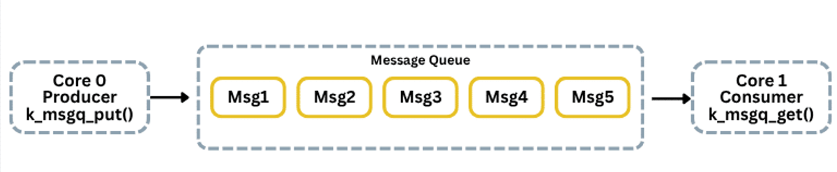 Here, Core 0 runs a producer task and uses k_msgq_put(). Core 1 runs a consumer task and retrieves messages via k_msgq_get().
